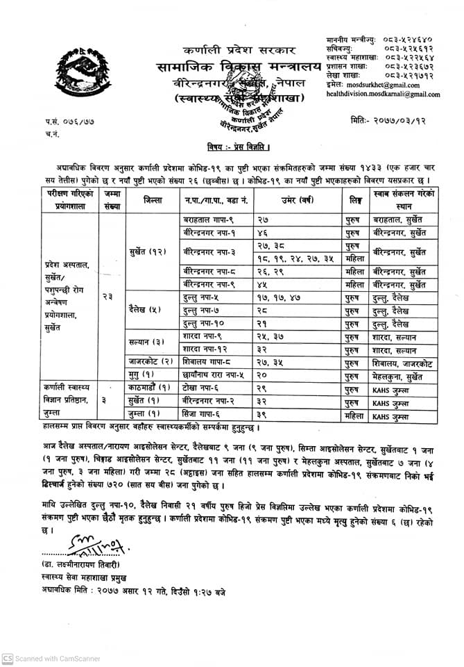 सुर्खेत । कर्णाली प्रदेशमा थप २६ जनालाई कोरोना भाइरस रोग (कोभिड १९) रोग पुष्टि भएको छ । सामाजिक विकास मन्त्रालय कर्णालीले दिउसो १ :२७ बजे गरेको अद्यावद्यिक अनुसार सुर्खेतका १२, दैलैखका ५, सल्यानका ३, जाजरकोटका २, मुगुका १, काठमाडौंका १, सुर्खेतका १ र जुम्लाका १ जनालाई कोरोना पोजेटिभ पुष्टि भएको छ ।