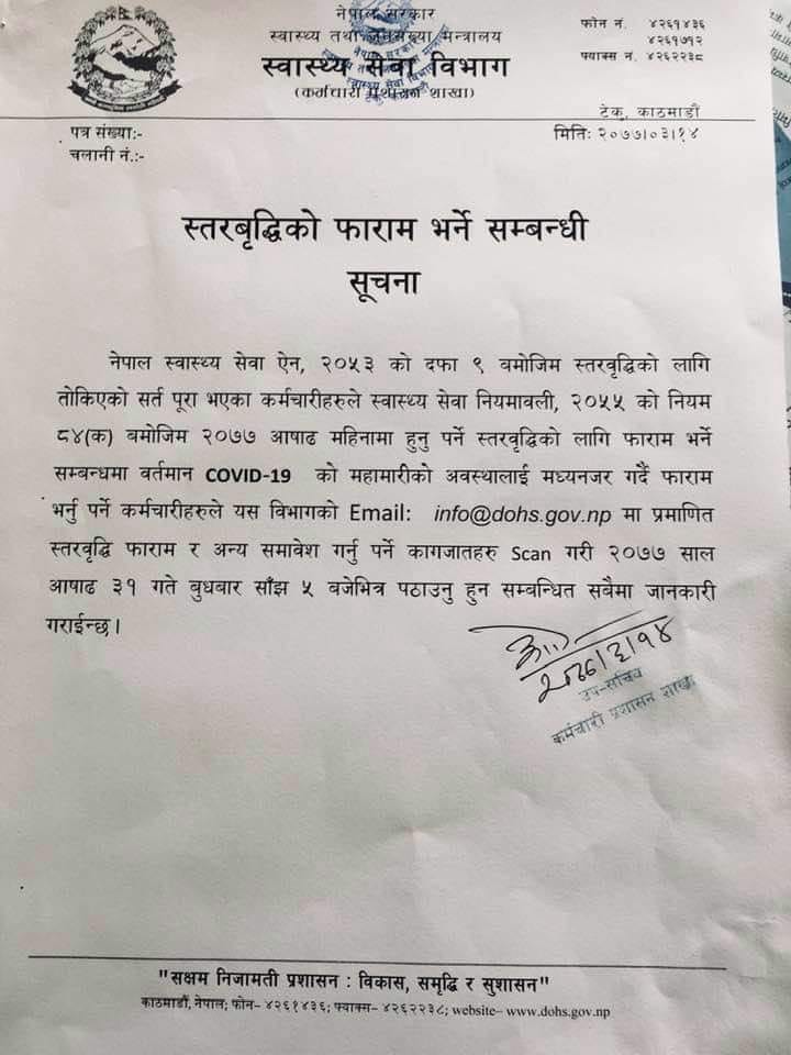 स्वास्थ्य सेवा ऐन नियमावली, २०५५ को नियम ८४(क) बमोजिम असार सम्ममा स्तरवृद्धि हुन सर्त पूरा भएका कर्मचारीहरुलाई असार ३१ गतेभित्र फारम भर्न विभागले अपिल गरेको छ । स्तरवृद्धि रोकिँदा ५ हजार भन्दा बढी कर्मचारी मर्कामा परेका छन् । स्वास्थ्य सेवा ऐन अनुसार प्रत्येक ६ महिनामा योग्यता पुगेका कर्मचारीको स्तरवृद्धि हुने व्यवस्था छ ।