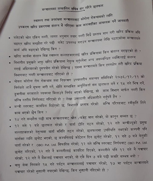 स्वास्थ्य मन्त्रालयका तत्कालीन सचिव यादव कोइरालालाई सोधिएका प्रश्न