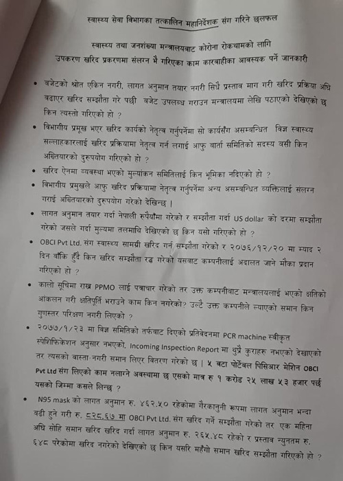स्वास्थ्य सेवा विभागका तत्कालीन महानिर्देशक महेन्द्र श्रेष्ठलाई सोधिएका प्रश्न