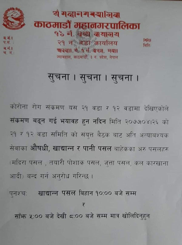 ‘संक्रमण बढ्न गइ भयावह हुन नदिन अति अत्यावश्यक सेवाका औषधी, खाद्यान्न र पानी पसल बाहेकका अरु पसलहरु तथा कलकारखाना बन्द गर्न अनुरोध गरिन्छ ।’ सूचनामा भनिएको छ।