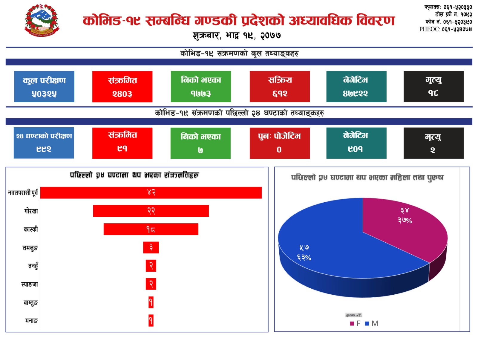 शुक्रबार ९९२ को नमुना परीक्षण गर्दा ९१ जनामा संक्रमण भएको पाइएको हो। सबभन्दा बढी पूर्वी नवलपरासीमा भेटिएका छन्। कोभिड–१९ सम्बन्धी गण्डकी प्रदेशको अद्यावधिक विवरणअनुसार पूर्वी नवलपरासीमा ४२ जना नयाँ संक्रमित भेटिएका हुन्। यससँगै जिल्लाभर संक्रमित हुनेको संख्या ५३१ पुगेको छ। त्यस्तै गोरखामा २२ नयाँ संक्रमित भेटिएका छन्।