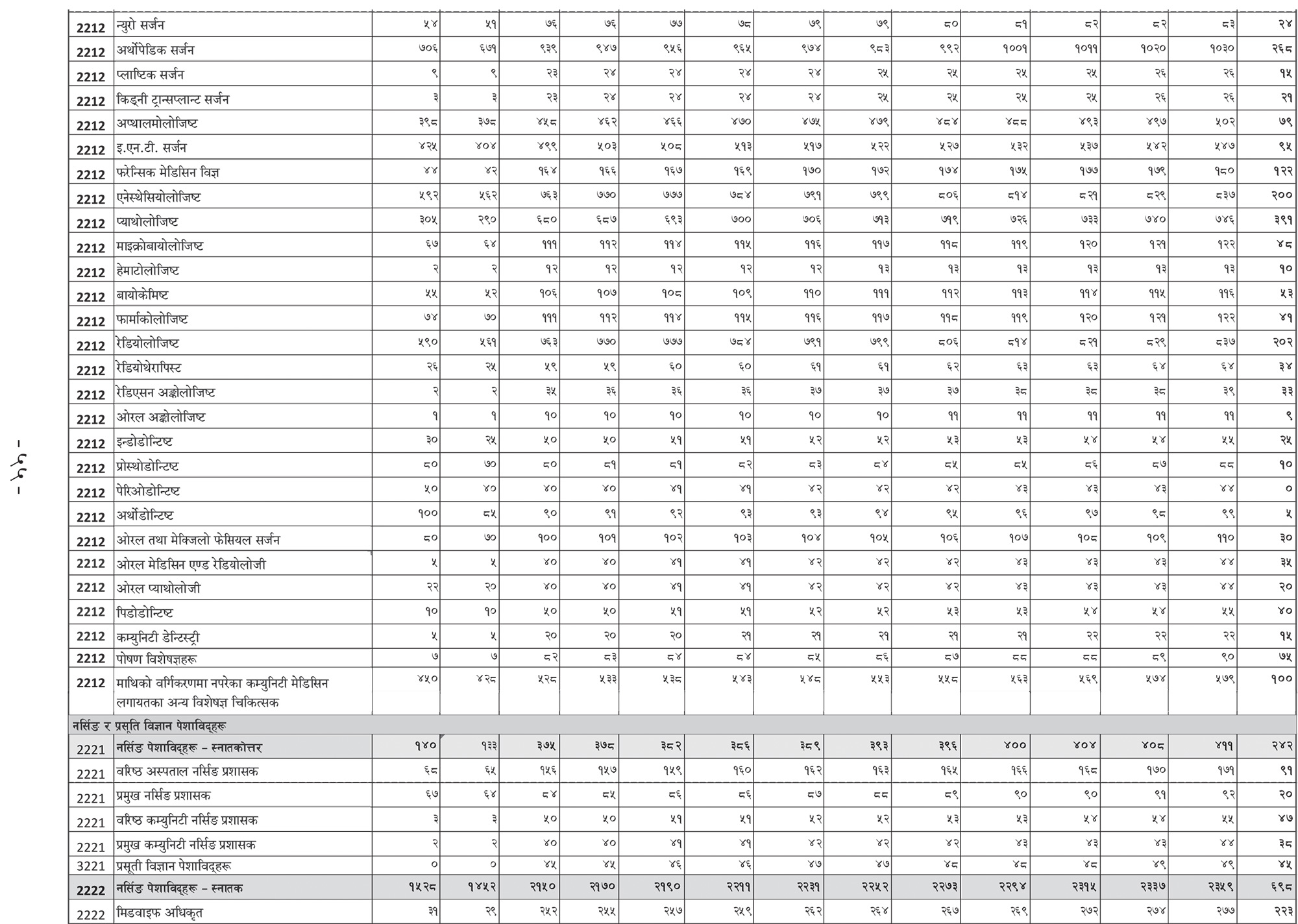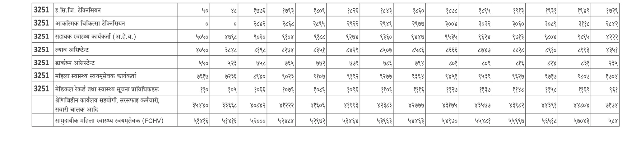 सबैभन्दा बढी नर्सिङ तथा प्रसूति सम्बन्धी सहायक पेसाविदहरू १ लाख १० हजार १५५ उत्पादन भएका छन्। त्यसैगरी अन्य स्वास्थ्य सम्बद्ध सहायक पेसाविद्हरूको (प्रमाणपत्र तह र तालिम) जनशक्ति उत्पादन ६१ हजार ५९४ भएको छ ।