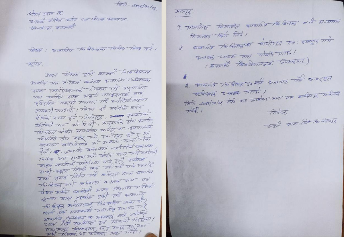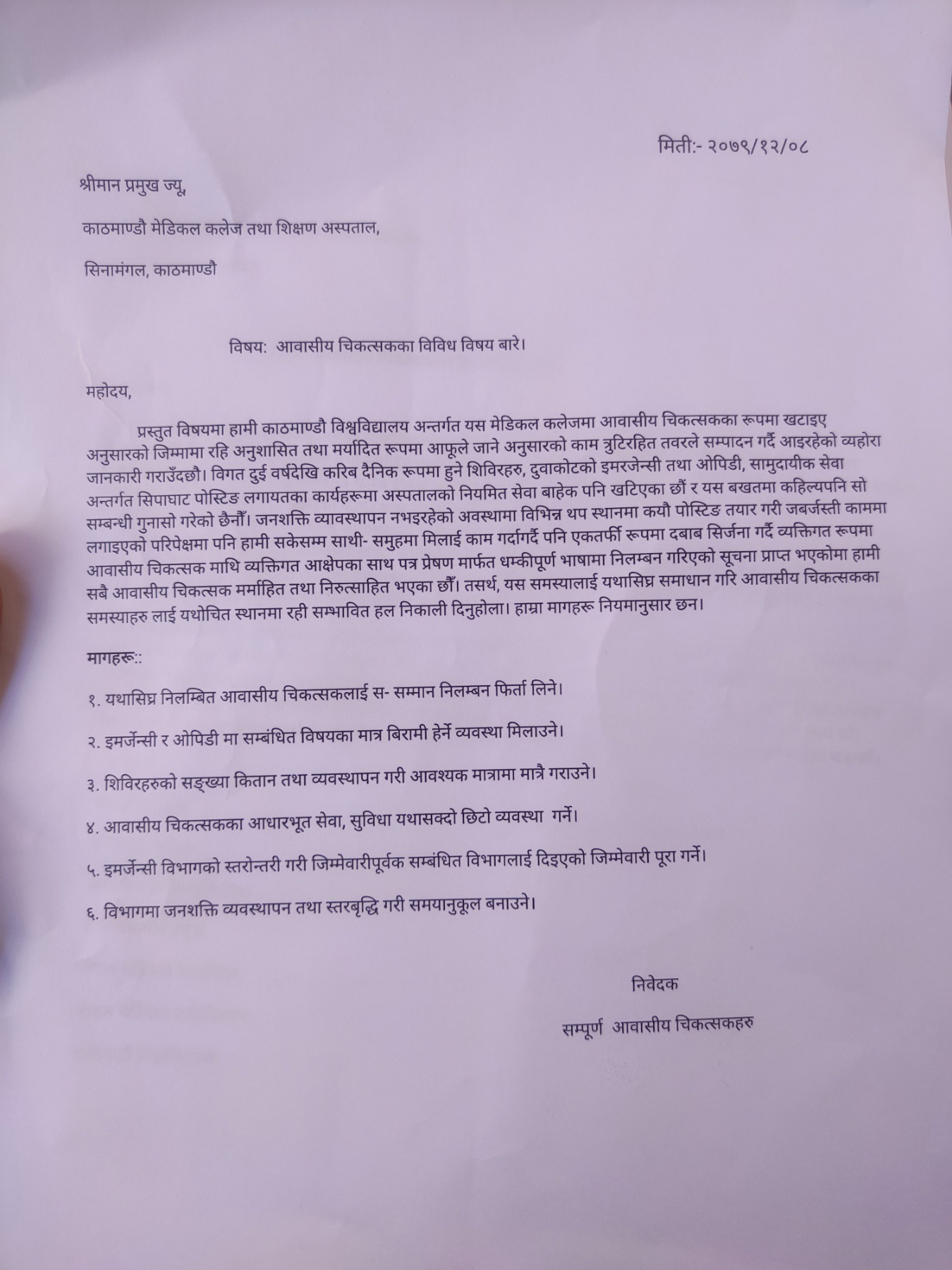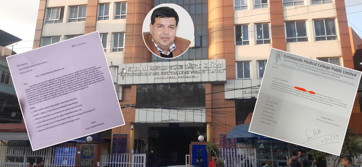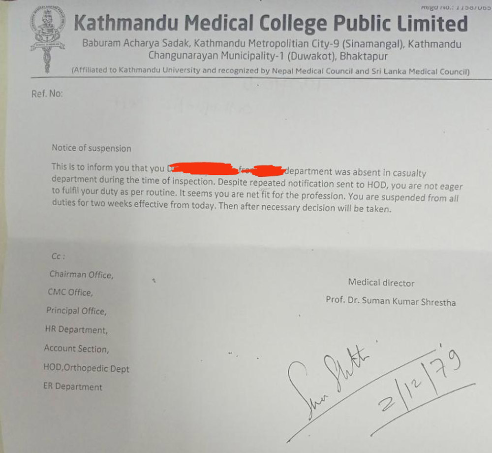 अस्पतालका मेडिकल डाइरेक्टर प्रा.डा.सुमन कुमार श्रेष्ठले चैत २ गते आवासीय चिकित्सकलाई निलम्बनको पत्र दिएको देखिन्छ ।