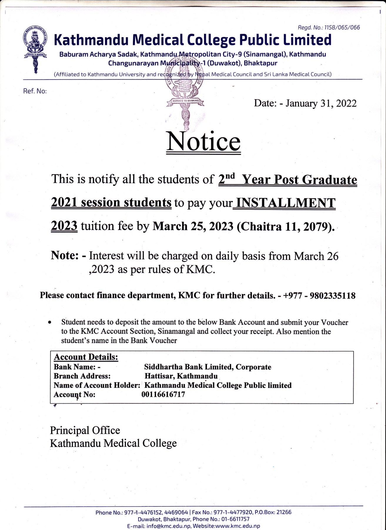 आवासीय चिकित्सकलाई समयमा तलब नदिने मेडिकल कलेजले आफूलाई बुझाउने शुल्कमा एक दिन बिलम्ब भएमा हरेक दिन जरीवाना थपिँदै जाने सूचना जारी गरेको देखिन्छ।