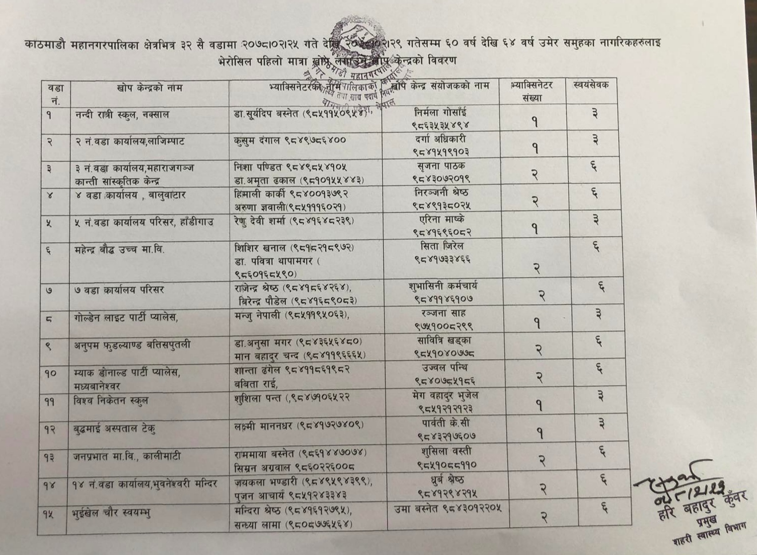 भेरोसेल लगाउन काठमाडाैं महानगरले तोक्यो ३२ वटा खोप केन्द्र