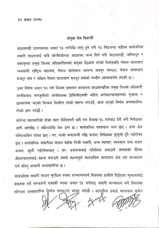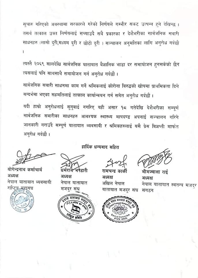 विज्ञप्तिमा उल्लेख गरिएको छ, ‘कोरोना महामारीको दोस्रो लहर फैलिएसंगै यही गत वैशाख १६ गतेबाट देशै भरी निषेधाज्ञा जारी भएपछि २ महिनादेखि देश ठप्प छ । सार्वजनिक यातायात बन्द छन् । अन्य क्षेत्र पनिप्रभावित रहेका छन् । तर, लामो बन्दावन्दी पछि क्रमशः निषेधाज्ञा खुकुलो हुँदै गईरहेका छन् । सार्वजनिक सवारीका साधन वाहेक निजी सवारी, अन्य व्यापार, व्यवसाय तथा बजार क्रमशः खुल्दै गईरहेकाछन् । तर, अर्थतन्त्रलाई गतिशिल बनाउने जनताको दैनिक जीवनयापनलाई सहज बनाउने जस्तो महत्वपूर्ण सार्वजनिक यातायात क्षेत्र भने सञ्चालन गर्न नदिनु अत्यन्तै अव्यवहारिक छ । ’