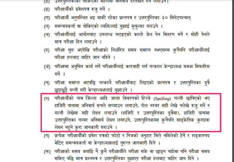 परीक्षार्थीको विवरण हाजिरी र उत्तरपुस्तिका दुवैमा गल्ती भएमा रजु गरी सच्याउन लगाउने काम निरीक्षकले गर्नुपर्ने भनिएको छ।