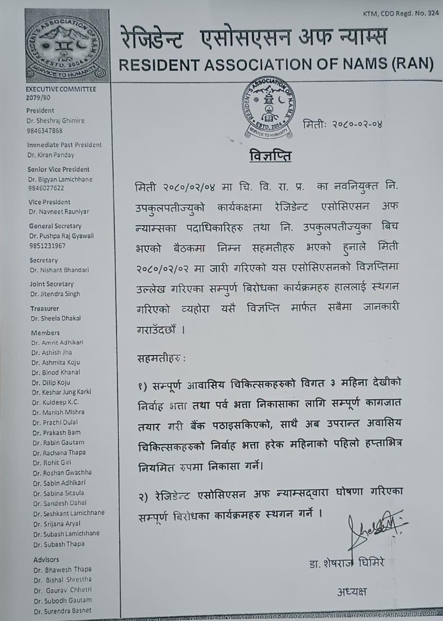 साथै अबदेखि निर्वाह भत्ता हरेक महिनाको पहिलो हप्ताभित्र नियमित रुपमा निकासा गर्ने सहमति पनि बैठकमा भएको छ । सहमतिपछि आवासीय चिकित्सकहरुको संस्था रेजिडेन्ट एसोसिएसन अफ न्याम्सले विज्ञप्ति निकालेर विरोधका कार्यक्रम स्थगित गरेको जानकारी दिएको छ।