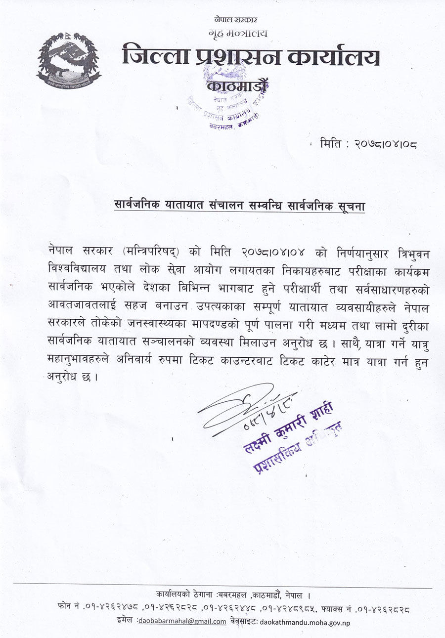जिल्ला प्रशासन कार्यालय काठमाडौले त्रिभुवन विश्वविद्यालय तथा लोक सेवा आयोग लगायतका परीक्षालाई समेत मध्यनजर गर्दै सरकारले तोकेको स्वास्थ्यका मापदण्ड पालना गरी सार्वजनिक यातायात चलाउन अनुमति दिएको हो ।