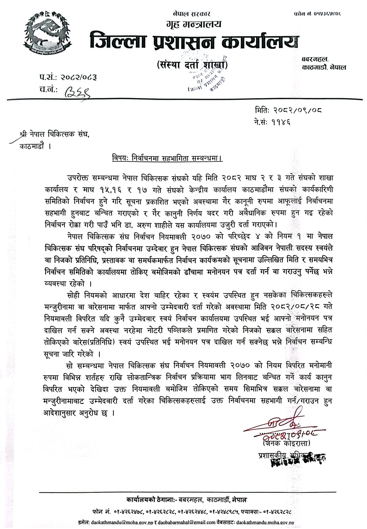 नेपाल चिकित्सक संघलाई जिल्ला प्रशासन काठमाडौंको पत्र : चिकित्सकलाई मनोमानी ढङ्गले चुनावी प्रक्रियाबाट वञ्चित नगर्नू