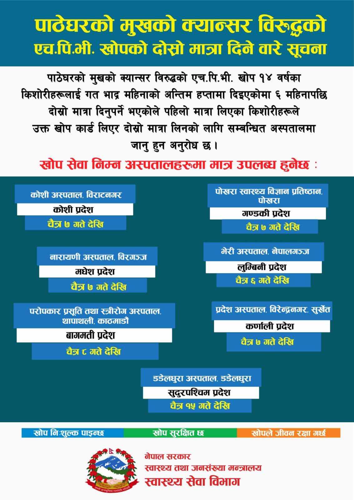 एचपीभी खोपको दोस्रो मात्रा सातै प्रदेशमा दिइँदै, कुन प्रदेशमा कहिले ?