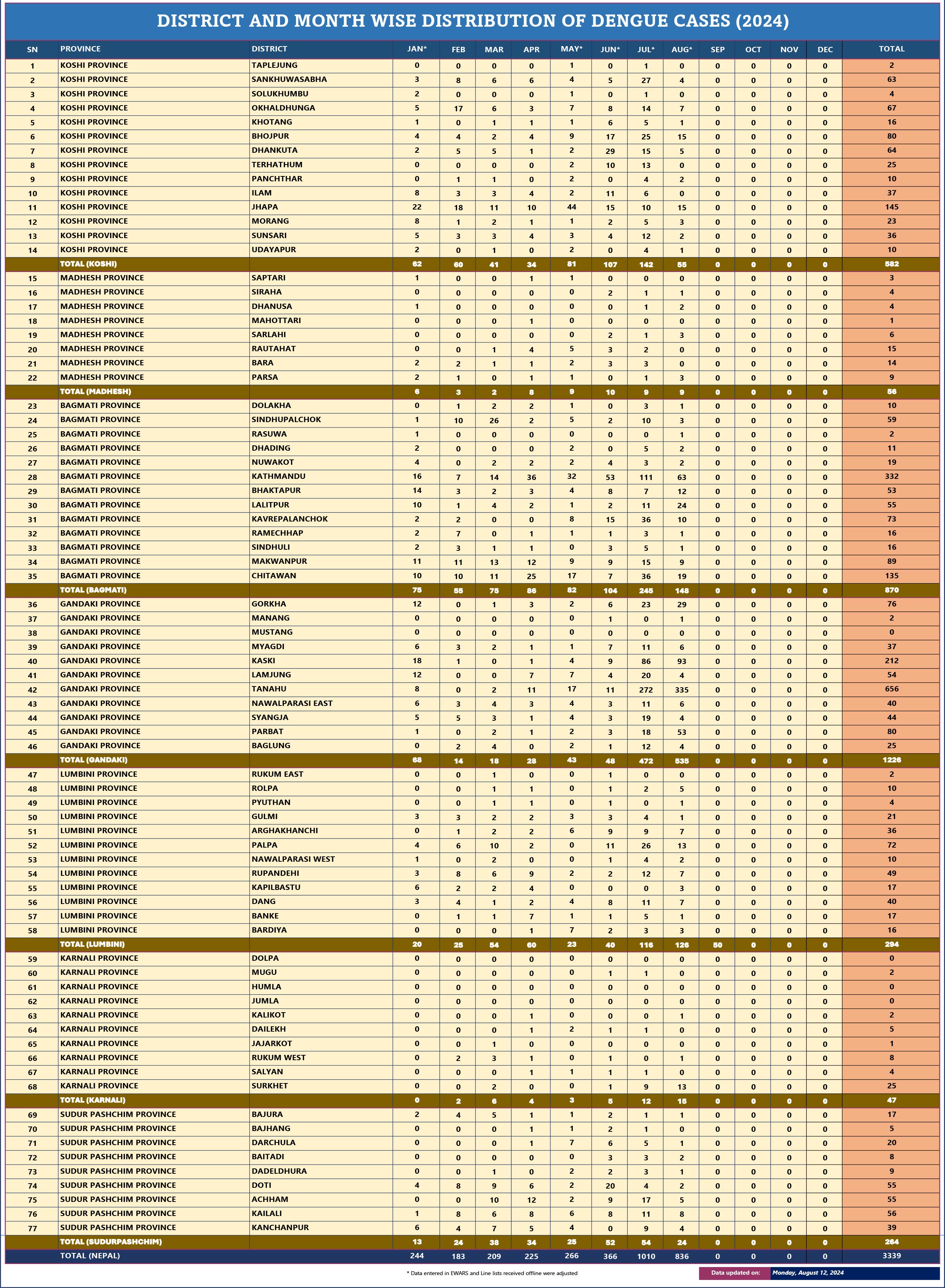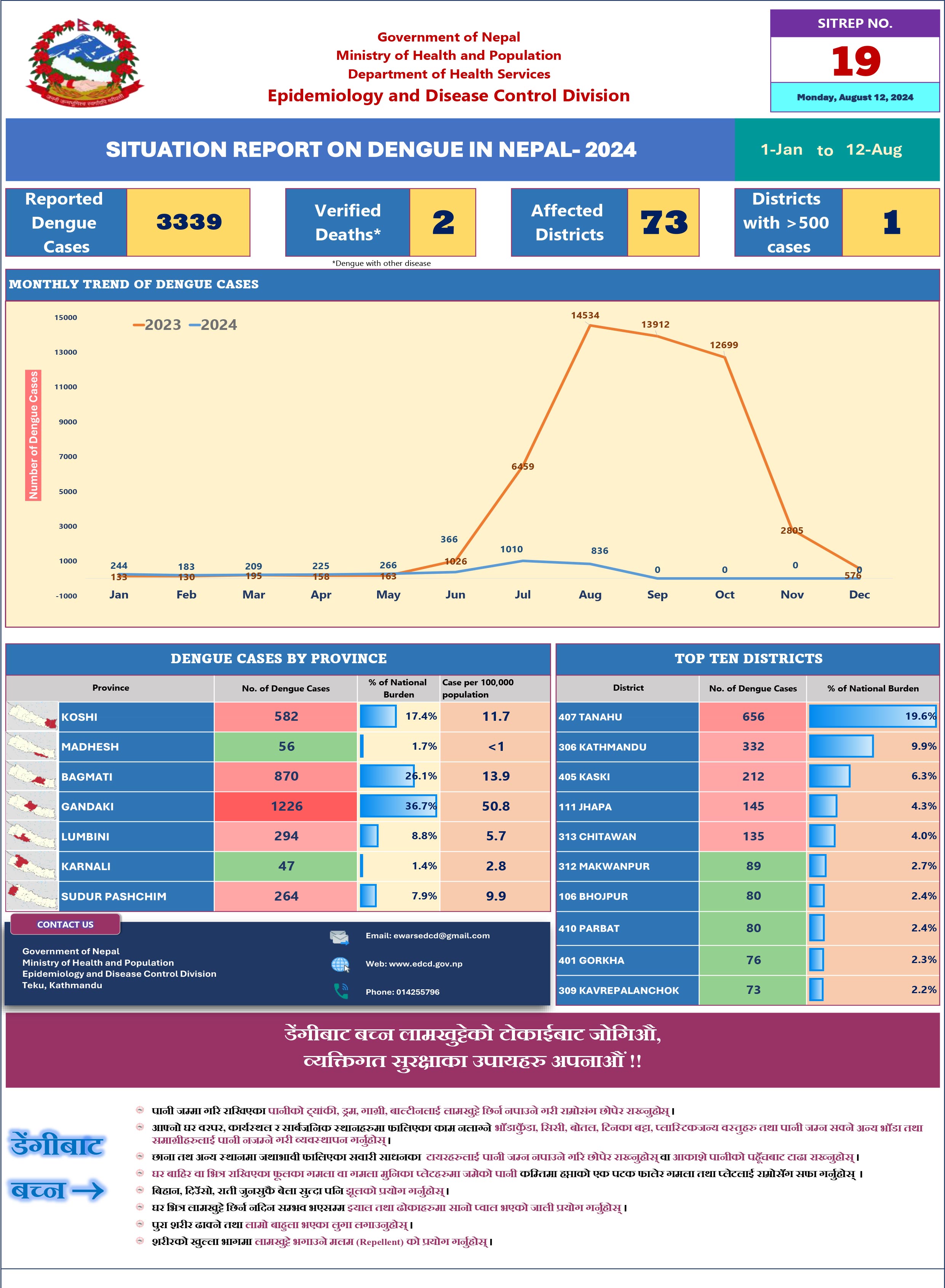 इडीसीडीले सोमबार दिएको जानकारी अनुसार यो वर्ष हालसम्म ३३३९ जना संक्रमित भइसकेका छन् । ७३ जिल्लामा डेंगी पुष्टि भएको छ भने एक जिल्लामा ५०० भन्दा बढी डेंगी संक्रमित रहेका छन् ।
