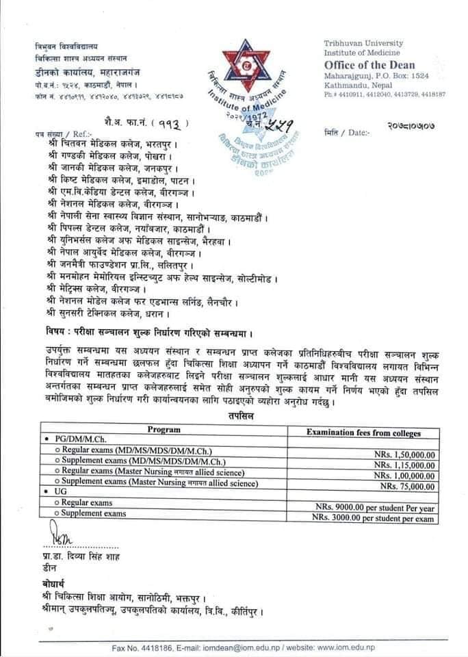 आइओएमले गत कार्तिक ७ गते आफु मातहतका १५ वटा मेडिकल कलेजलाई परीक्षा शुल्क निर्धारण गरि कार्यान्वयनका लागि पत्र काटेको थियो । स्नातक तहको परीक्षा शुल्क नियमित तर्फ २५ सयबाट ९ हजार, स्नातकोत्तर तर्फ चिकित्सा विज्ञानको १ लाखबाट डेढ लाख र नर्सिङ तथा पारामेडिक्सको १ लाख निर्धारण गरिएको छ ।