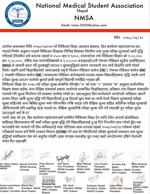 ‘चिकित्सा शिक्षा ऐन को परीक्षा शुल्क सम्बन्धि परिच्छेद ७ को दफा २ अनुसार सार्वजनिक शिक्षण संस्था बाहेक अन्य शैक्षिक संस्थाको हकमा आयोगले सम्बन्धित विश्वविद्यँलय, प्रतिष्ठान तथा शिक्षण संस्थासँग परामर्श गरि शुल्क निधारण गर्ने व्यवस्था छ । जसअुनसार डिन कार्यालयले आयोगको अधिकार आफ्नै हातमा लिएर आफैं शुल्क वृद्धि गरि विद्यार्थीलाई दुख दिएको कुरा स्पष्ट छ ।’ विज्ञप्तिमा भनिएको छ ।