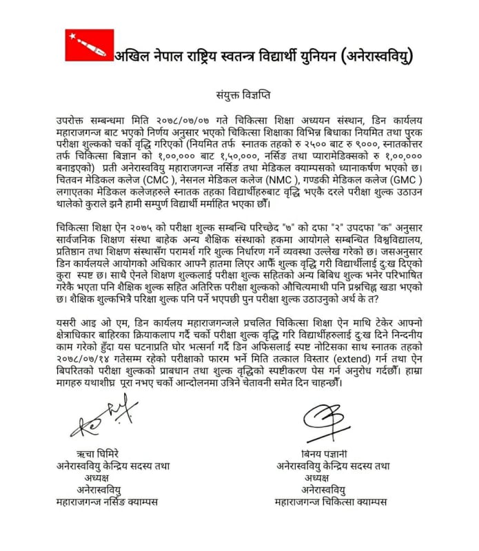 अनेरास्ववियु महाराजगञ्ज नर्सिङ क्याम्पसका अध्यक्ष ऋचा घिमिरे, अनेरास्ववियु महाराजगञ्ज चिकित्सा क्याम्पसका अध्यक्ष विनय पज्ञानी र एनएमएसएका अध्यक्ष डा.मिलन गैरेले विज्ञप्ति निकालेर डिन कार्यालयलाई उक्त निर्णय फिर्ता लिन आग्रह गर्नुभएको छ । यदि त्यसाे नभए चर्काे आन्दोलनमा उत्रने चेतावनी उहाँहरुले दिनुभएको छ ।