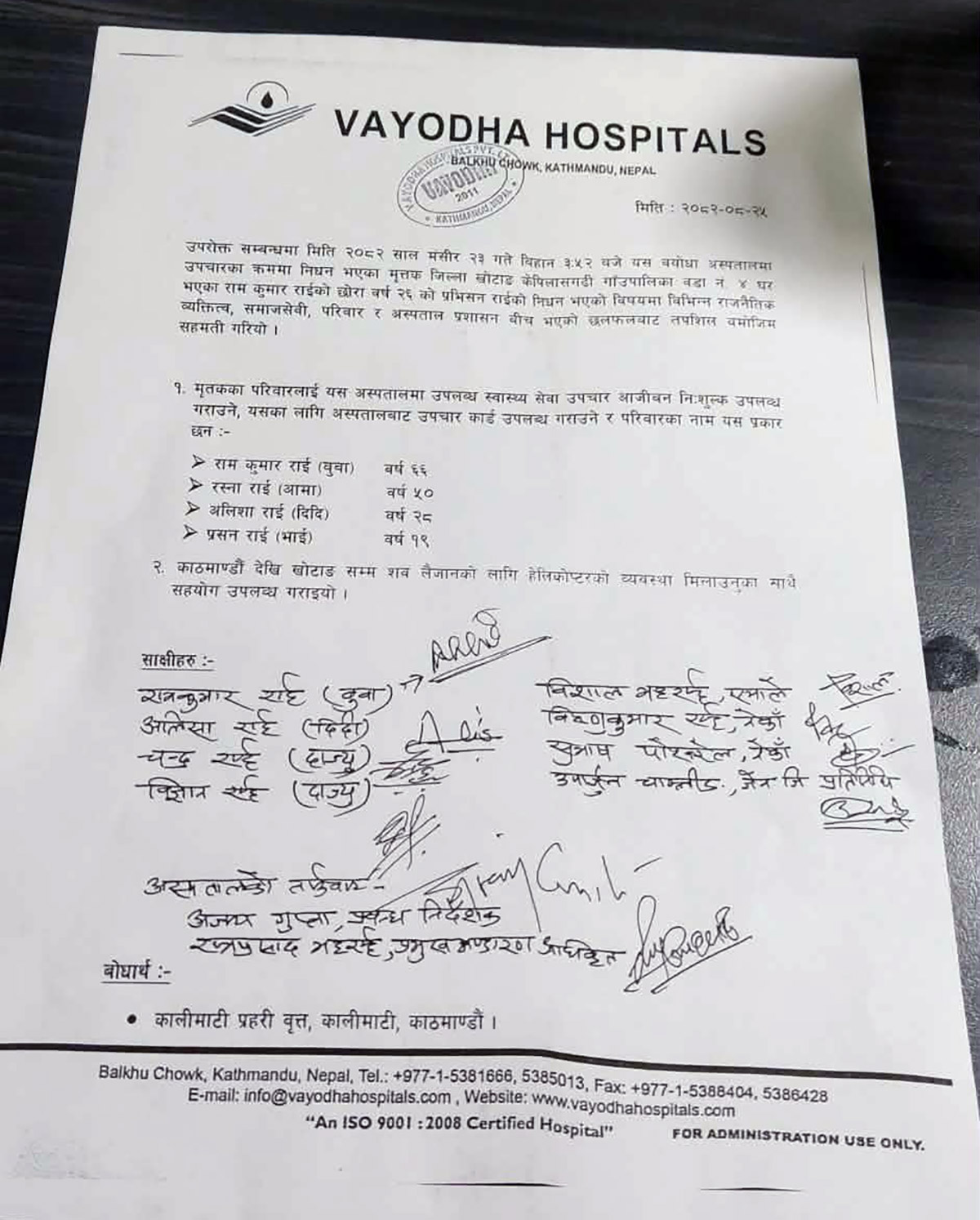 खोटाङका राजनीतिक दलका प्रतिनिधि तथा अगुवाको रोहबरमा अस्पताल र आफन्तबीच दुई बुँदे सम्झौता भएको हो । सम्झौताअनुसार अस्पतालले मृतक राईका आमाबुवा र एक दिदीको उपचार गर्नेछ । त्यस्तै अर्का एक जना भाइको समेत अस्पतालले आजीवन उपचार गर्नेछ ।
