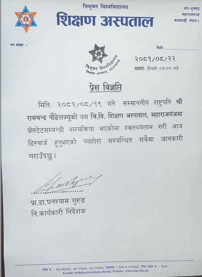 महाराजगञ्जस्थित त्रिभुवन विश्वविद्यालय शिक्षण अस्पतालका निमित्त कार्यकारी निर्देशक प्राडा. घनश्याम गुरुङले प्रोस्टेटसम्बन्धी शल्यक्रिया गर्नुभएका राष्ट्रपति पौडल डिस्चार्ज हुनु भएको जानकारी दिनुभयो ।