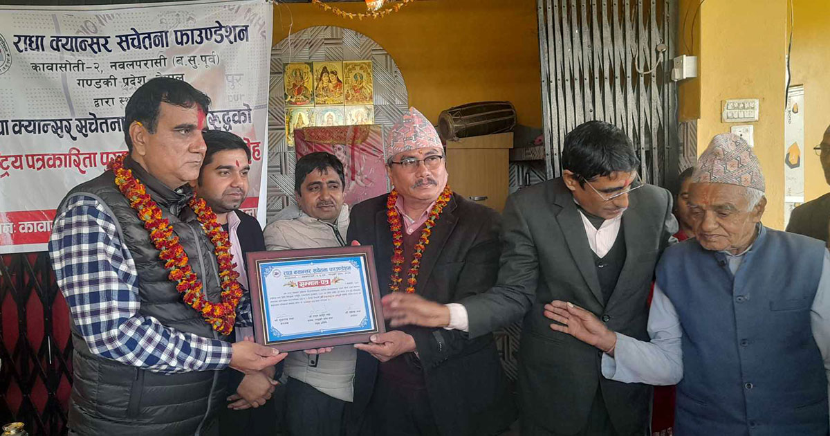 राधा क्यान्सर सचेतना तथा हिंसाविरुद्धको राष्ट्रिय पत्रकारिता पुरस्कार पत्रकार पदमराज जोशीले पाउनुभएको छ । नवलपरासी (पूर्व)मा आज भएको एक समारोहका बीच जोशीले पुरस्कार ग्रहण गर्नुभएको हो ।