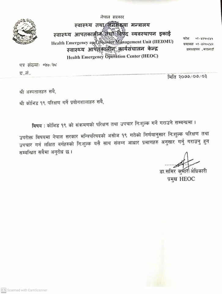 काठमाडौं । स्वास्थ्य तथा जनसंख्या मन्त्रालयले कोरोना परीक्षण तथा उपचार निःशुल्क गर्ने सम्बन्धमा देशभरका सबै अस्पताल र प्रयोगशालाहरुलाई पत्र काटेको छ । तर सबैले यो सुविधा पाउने छैनन् ।