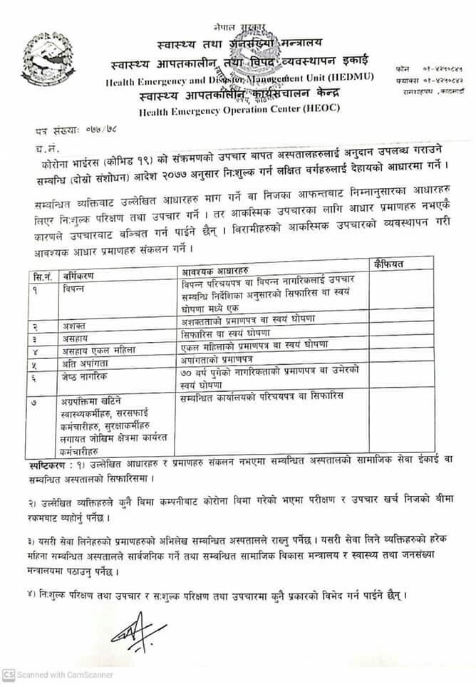 मन्त्रिपरिषद्को असोज १९ गतेको निर्णय अनुसार विपन्न, अशक्त, असहाय, असहाय एकल महिला, अति अपांगता, ७० वर्ष नाघेका जेष्ठ नागरिक तथा अग्रपंक्तिमा खटिने स्वास्थ्यकर्मी, सरसफाई कर्मचारी, सुरक्षाकर्मी लगायत जोखिम क्षेत्रमा कार्यरत कर्मचारीहरुले निःशुल्क उपचार पाउनेछन् ।