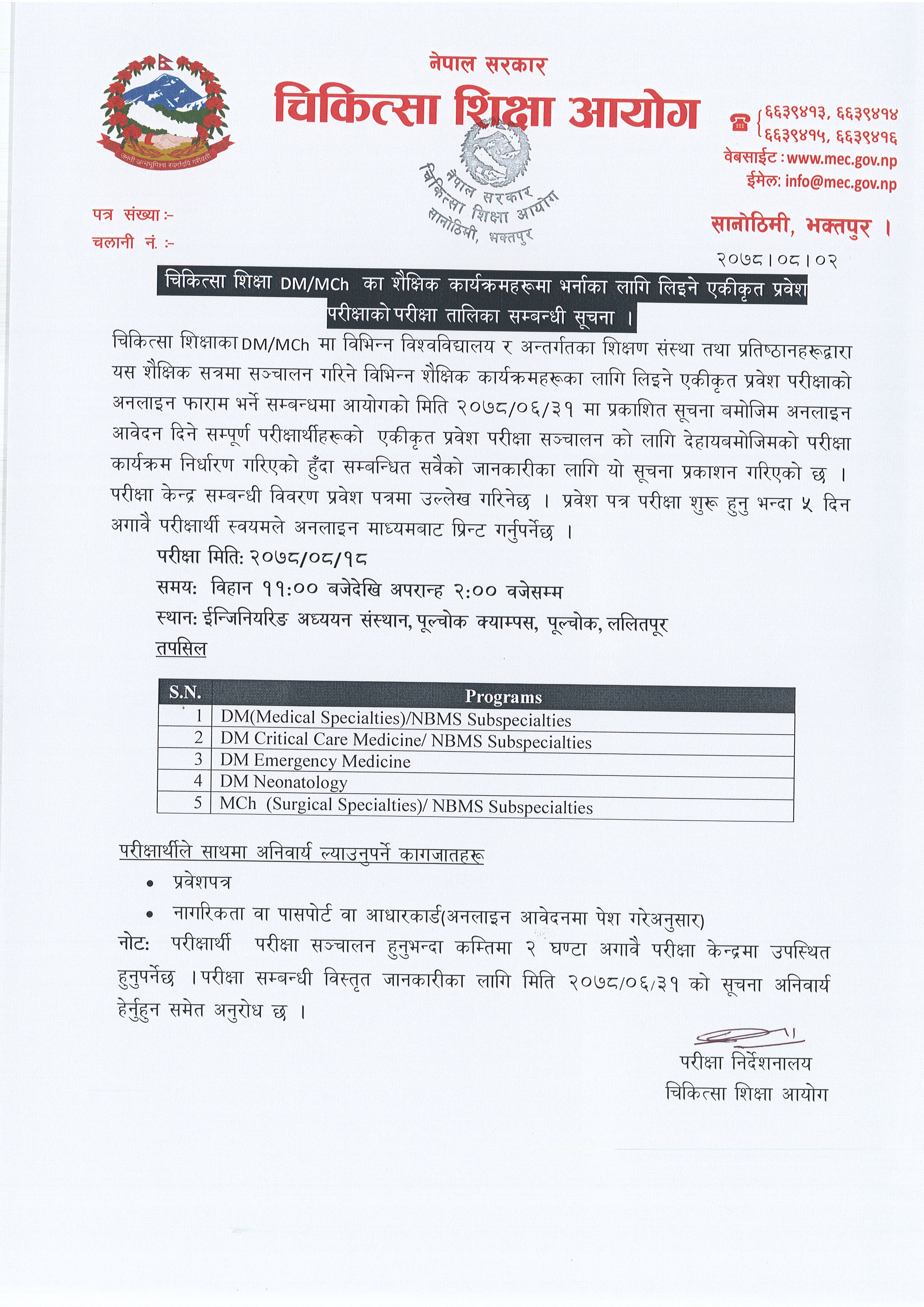 डिएम र एमसिएचको एकीकृत प्रवेश परीक्षा मंसिर १८ गते