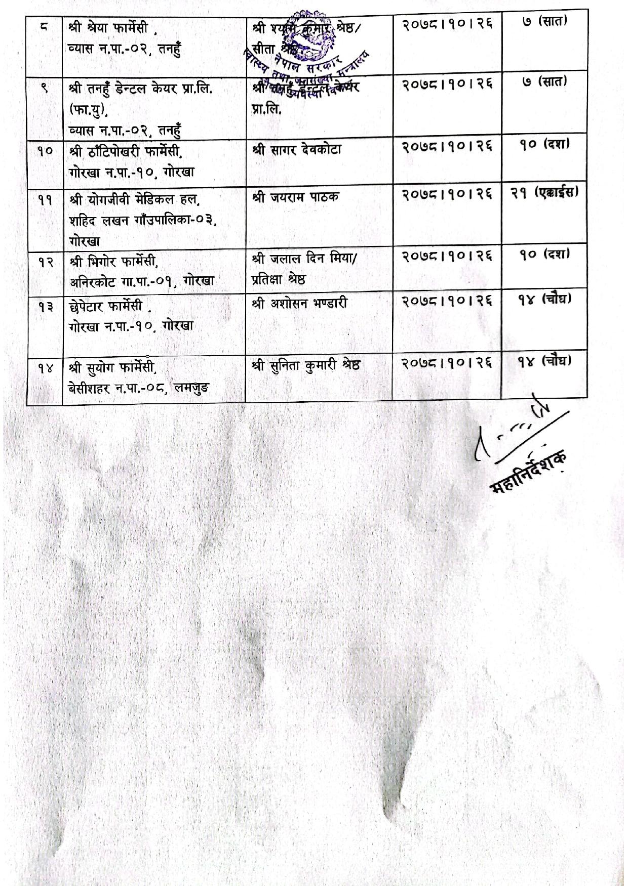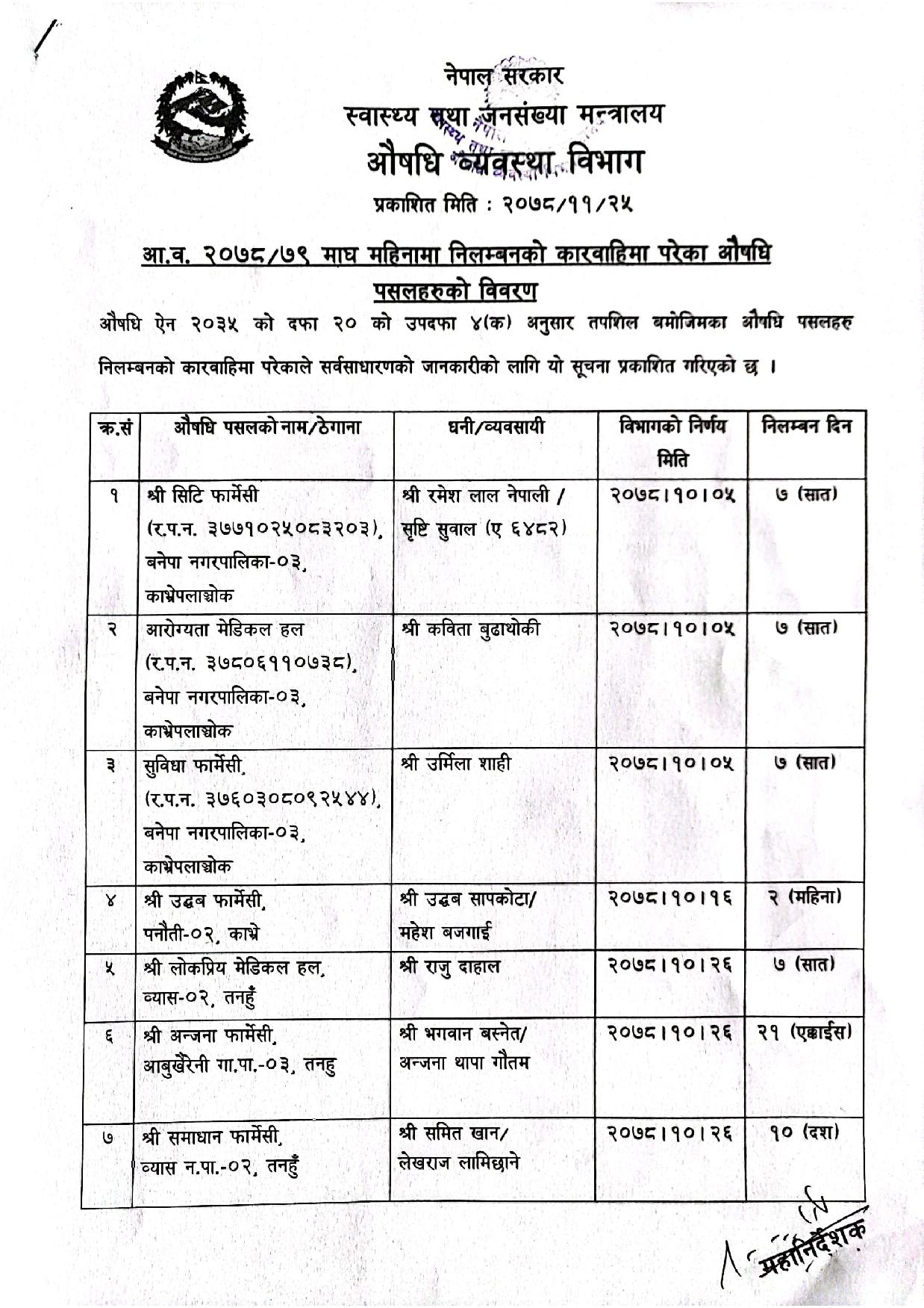 कारबाहीमा परेका औषधि पसलहरु काभ्रे, गोरखा, लमजुङ र तनहुँका रहेका छन् । विभागले औषधि ऐन २०३५ को दफा २० को उपदफा ४ (क) अनुसार अनुसार कारबाही गरेको हो ।