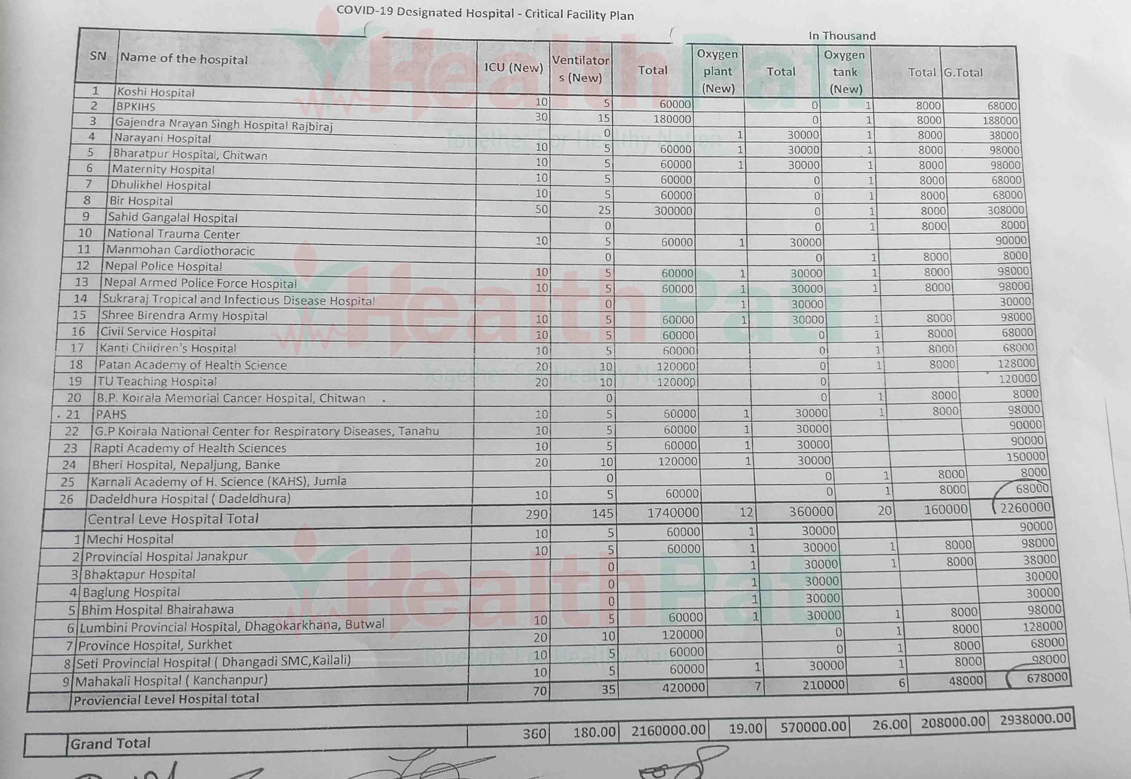 वीर अस्पताल, त्रिवि शिक्षण अस्पताल, ट्रमा सेन्टर, पाटन, भेरीसहित २६ वटा अस्पतालमा २९० वटा आइसियु र १४५ वटा भेन्टिलेटर थपिदैछ । साथै उक्त अस्पतालहरुमा १२ वटा अक्सिजन प्लान्ट र २० वटा ट्यांक थप हुनेछन् । यसैगरी प्रदेश स्तरका ६ वटा अस्पतालमा ७० वटा आइसियु, ३५ वटा भेन्टिलेटर जोडिनेछन् भने त्यहाँ ७ वटा अक्सिजन प्लान्ट र ६ वटा ट्याङक थपिने छन् ।