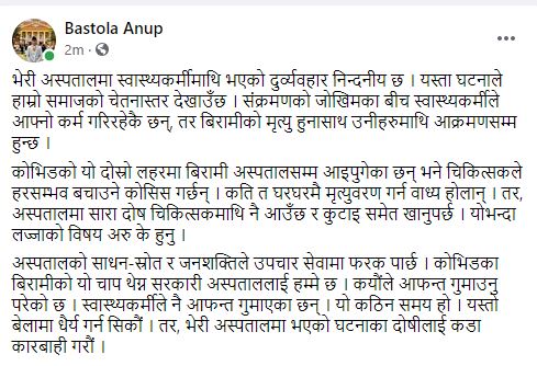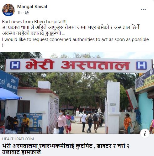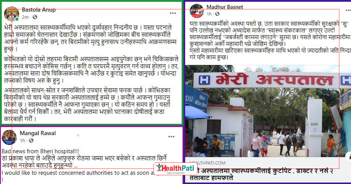 यसैगरी शुक्रराज ट्रपिकल तथा सरुवा रोग अस्पतालका प्रमुख कन्सल्टेन्ट डा. अनुप बाँस्तोलाले भेरी अस्पतालमा स्वास्थ्यकर्मीमाथि भएको दुर्व्यवहार निन्दनीय रहेको र यस्ता घटनाले हाम्रो समाजको चेतनास्तर देखाएको बताउनुभएको छ ।