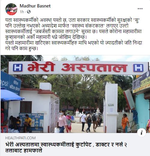 साथै डा.मधुर बस्नेतले महामारीमा खटिएका स्वास्थ्यकर्मीहरु माथि भएको यो ज्यादतीको जति निन्दा गरेपनि कम हुने बताउनुभएको छ । उहाँ भन्नुहुन्छ, ‘यता स्वास्थ्यकर्मीको अवस्था यस्तो छ, उता सरकार स्वास्थ्यकर्मीको सुरक्षाको ‘सु’ पनि उल्लेख नभएको अध्यादेश मार्फत स्वास्थ्य संकटकाल लगाएर उल्टो स्वास्थ्यकर्मीलाई जबरजस्ती काममा लगाउनेू सुरमा छ। यसले कोरोना महामारीमा कुशासनको अर्को महामारी थप्ने जोखिम देखिन्छ।’