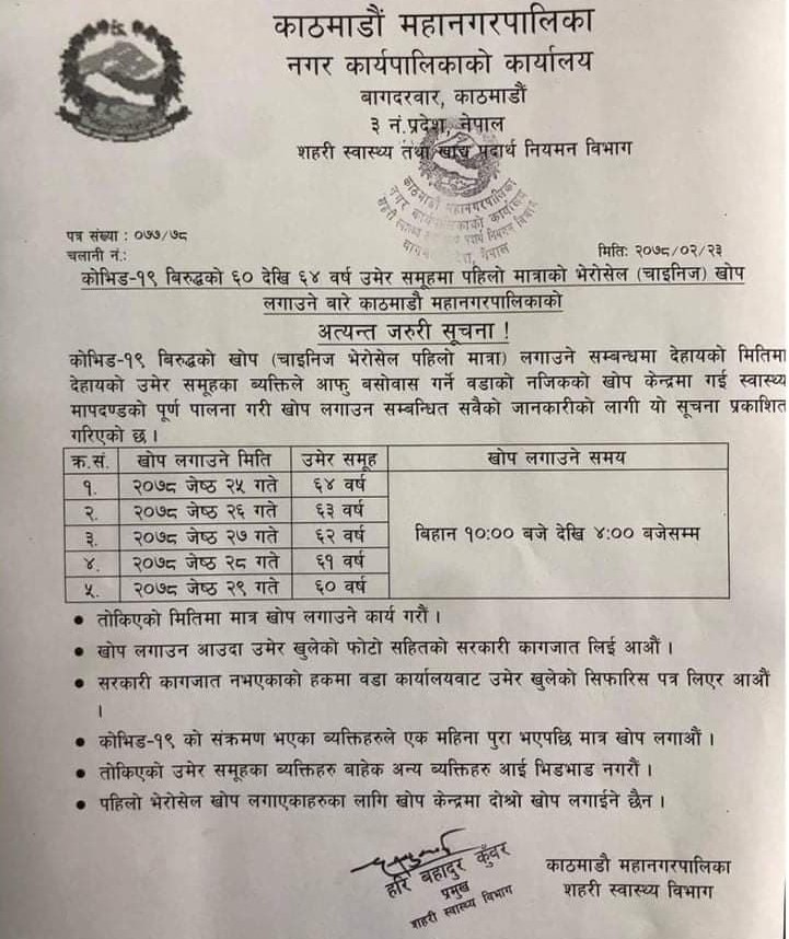 भेरोसेल खोप : काठमाडौंमा कुन दिन - कुन उमेरका व्यक्तिले पाउने ?