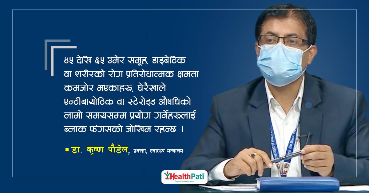 ईपिडिमियोलोजी तथा रोग नियन्त्रण महाशाखा प्रमुखसमेत रहनुभएका स्वास्थ्य तथा जनसंख्या मन्त्रालयका प्रवक्ता डा.कृष्ण पौडेलले नेपालमा १० जना संक्रमितलाई कालो ढुसीको समस्या देखिएको रिपोर्टिङ भएको जानकारी दिनुभयो । उहाँले यो समस्या ४५ देखि ६५ वर्ष उमेरसम्मका लागि देखिएको बताउनुभयो ।