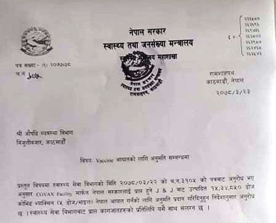 पत्रमा भनिएको छ’कोभ्याक्स फ्यासिलिटि मार्फत नेपाललाई प्राप्त हुने जोन्सन एन्ड जोन्सनबाट उत्पादित १५ लाख ३४ हजार ८५० डोज कोभिड भ्याक्सिन (५ डोज÷भाइल) नेपाल आयात गर्नका लागि अनुमति प्रदान गरिदिनुहुन निर्देशानुसार अनुरोध छ ।