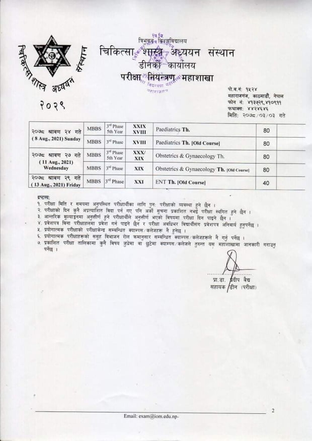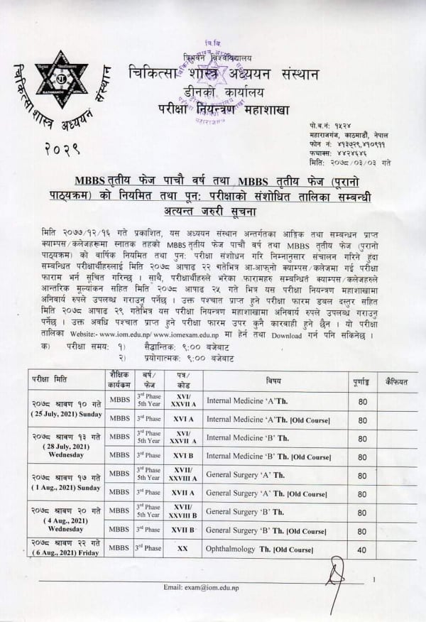 यसअघि एमबीबीएस अन्तिम वर्षको परीक्षा असार २१ गते तोकिएको थियो तर निषेधाज्ञाका कारण आइओएमले परीक्षा स्थगित गरेको थियो । एमबीबीएसका ६२६ जना विद्यार्थीमाझ हालै गरिएको एक सर्वेमा ३४ प्रतिशत विद्यार्थीले दुबैमात्रा र ३३ प्रतिशतले पहिलो मात्रा खोप पाएका छन् । यस अवस्थामा ९० प्रतिशत विद्यार्थीले परीक्षामा सहभागी हुन नसक्ने बताएका छन् ।