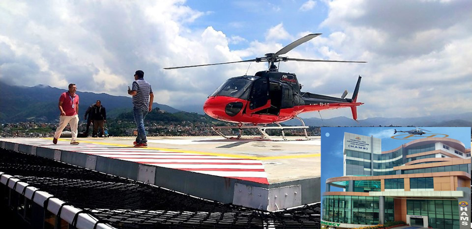 ह्याम्स अस्पतालको छतमा ल्याण्ड गरिएको हेलिकप्टर बाँया, ह्याम्स अस्पताल दाँया । तस्बिर : ह्याम्स अस्पतालको वेबसाइटबाट ।