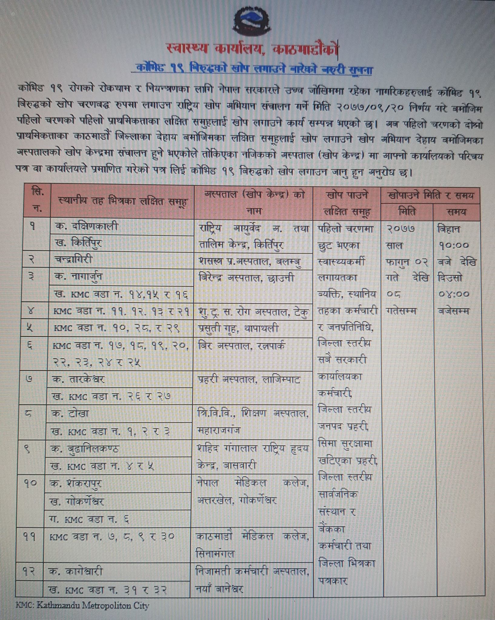 स्वास्थ्य तथा जनसंख्या मन्त्रालयले फागुन २ देखि ८ गतेसम्म चल्ने खोप अभियानमा सबै सरकारी कार्यालय, सार्वजनिक संस्थान तथा बैंकका कर्मचारीहरु, पत्रकार, स्थानीय तहका निर्वाचित जनप्रतिनिधि, सिमा सुरक्षा पोष्टमा खटिएका सुरक्षाकर्मी, पहिला छुटेका स्वास्थ्यकर्मी, स्वास्थ्य स्वयम्सेवक, एम्बुलेन्स तथा शववाहन चालक, शव व्यवस्थापनमा खटिएका सुरक्षाकर्मीहरुलाई खोप दिइने जानकारी दिएको छ ।