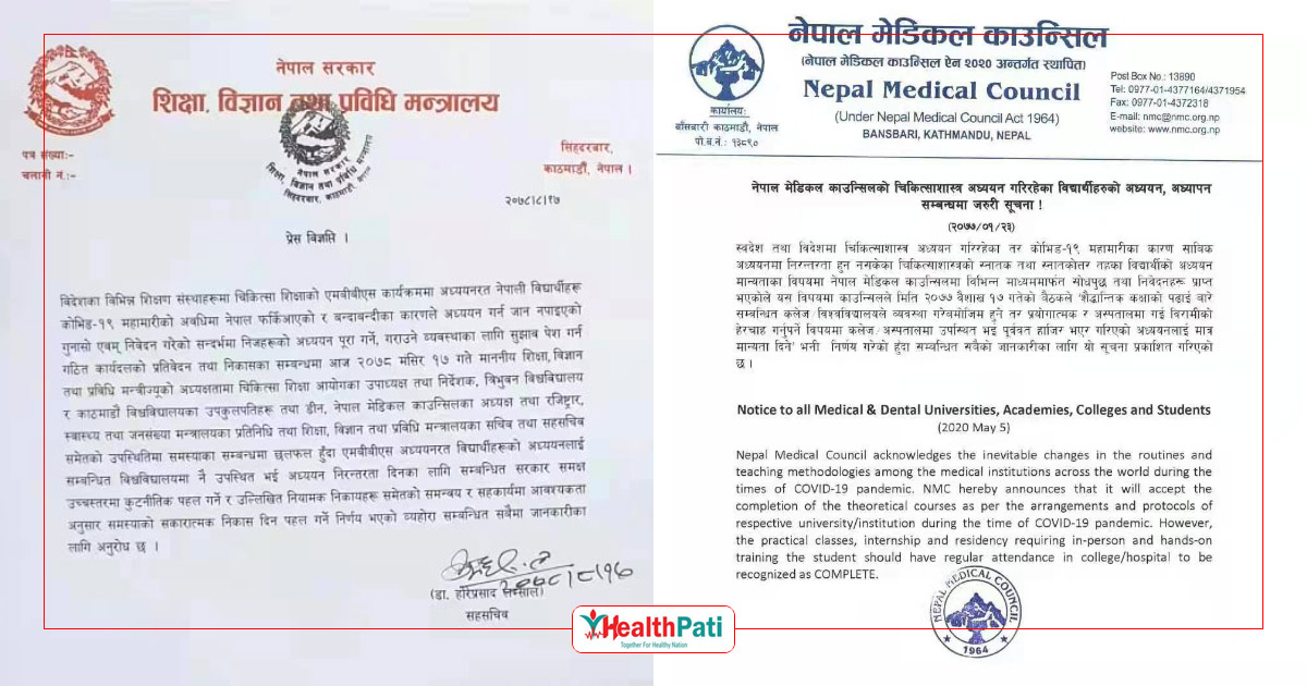 २०७७ साल बैशाख २३ गते निकालेको उक्त सूचनामा भनिएको थियो, ‘स्वदेश तथा विदेशमा चिकित्सा शास्त्र अध्ययन गरिरहेका तर महामारीका कारण नियमित पढाइ हुन नसकेका विद्यार्थीलाई सम्बन्धित कलेज तथा विश्व विद्यालयले व्यवस्था गरेअनुसार सैद्धान्तिक पढाइ हुन्छ । तर प्रयोगात्मक र अस्पतालमा गई बिरामीको हेरचाह गर्नुपर्ने विषयमा अस्पतालमै हाजिर हुनपर्नेछ।’