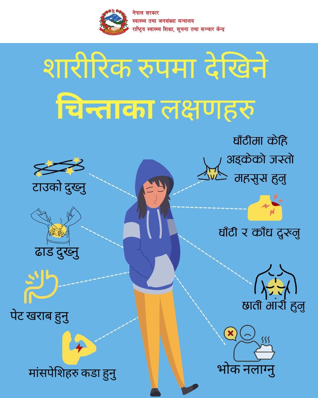 स्वास्थ्य तथा जनसङ्ख्या मन्त्रालयले मानसिक समस्याका कारण शरीरमा देखिने विभिन्न लक्षणहरूलाई बेवास्ता नगर्न आग्रह गरेको छ। मन्त्रालयको राष्ट्रिय स्वास्थ्य शिक्षा, सूचना तथा सञ्चार केन्द्रका अनुसार, मानसिक चिन्ता केवल मनमा होइन, शरीरमा पनि विभिन्न समस्या भएर प्रकट हुन सक्छ।