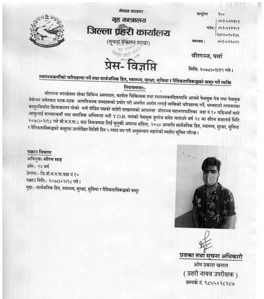 आफुलाई सञ्चारकर्मी तथा अभियन्ता भनी Y.0.B नामको फेसबुक ग्रुपपेजबाट डाक्टर तथा स्वास्थ्यकर्मीलाई आपत्तिजनक शब्द प्रयोग गरी अनर्गल आरोप लगाई चरित्रहत्या गरेको तथा धम्क्याएको आरोपमा प्रहरीले घडीअर्वा बस्ने २४ वर्षका सौरभ साहलाई जेठ १८ गते पक्राउ गरेको हो ।