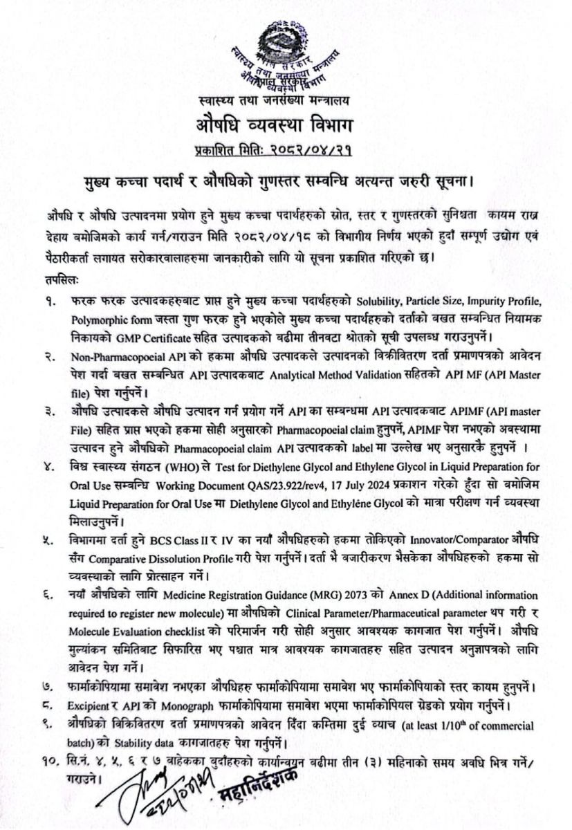 औषधि व्यवस्था विभागले औषधि तथा त्यसका कच्चा पदार्थको गुणस्तर, सुरक्षा र प्रभावकारिता सुनिश्चित गर्न १० बुँदे निर्देशन जारी गरेको छ। विभागको २०८२ साउन १८ गतेको निर्णयअनुसार, अबदेखि उद्योग तथा पैठारीकर्ताले कच्चा पदार्थको स्रोत, स्तर, र वैज्ञानिक मापदण्डहरू पालना गर्न अनिवार्य गरिएको छ।