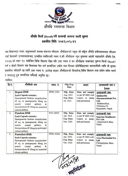 बुधबार प्रकाशित सूचनाअनुसार सिद्धार्थ फर्मास्यूटिकल्स प्रालिबाट उत्पादित DPSC-3301 ब्याचको Dopan-DSR औषधि रिकल गर्न भनिएको छ । त्यस्तै सुप्रिम हेल्थकेयर प्रालिको PAC-24052 ब्याचको Pandom-DSR औषधि र आर्या फर्मा ल्याब प्रालिको PFDC01041 ब्याचको Pantafast-DSR नामको औषधि फिर्ता गर्न भनिएको हो ।