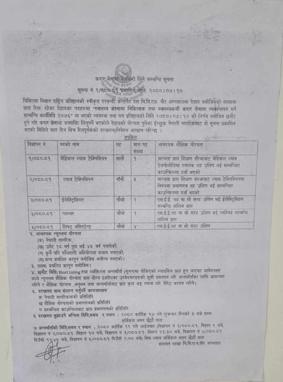 उक्त सूचनाअनुसार मेडिकल ल्याब टेक्नेसियन, ल्याब टेक्नेसियन, इलेक्ट्रिसियन, प्लम्बर, लिफ्ट असिस्टेन्टसहित १३ जना कर्मचारी माग भएको छ। उक्त पदमा दरखास्त दिनका लागि योग्य उम्मेदवारलाई शुक्रबारसम्मको समयमात्रै दिइएको भएपनि सूचनानै लुकाउने काम भएको एक अधिकारीले जानकारी दिनुभयो । यो सूचनाबारे न्याम्स र अस्पताल प्रशासनसँग बुझ्न खोज्दा उहाँहरु