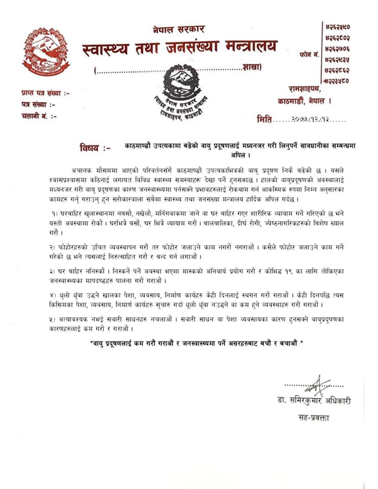 प्रदुषण अत्याधिक भएको भन्दै घरबाट बाहिर ननिस्कन अपिल