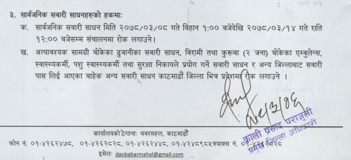त्यस्तै अन्य जिल्लाबाट सवारी पास लिई आएका बाहेक अन्य सवारी साधनलाई काठमाडौं उपत्यकामा प्रवेश रोक लगाइएको काठमाडौंका प्रमुख जिल्ला अधिकारी कालीप्रसाद पराजुलीले जानकारी दिनुभयो ।