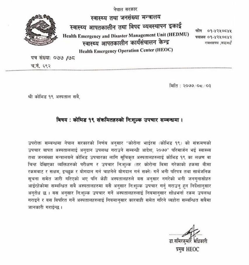 सो अनुसारको निर्देशन पालना नगरी केही अस्पतालले शुल्क लिएको भन्दै स्वास्थ्य मन्त्रालयले मंसिर ३ गते देशभरका सबै कोभिड अस्पताललाई सम्बोधन गर्दै पत्र लेखेको छ। निशुल्क उपचार गर्ने सबै कोभिड अस्पतालको सोध भर्ना गर्ने र सो अनुसार नगरी संक्रमितसँग रकम असुल्ने अस्पताललाई कारबाही गरिने ब्यहोरा पत्रमा छ।