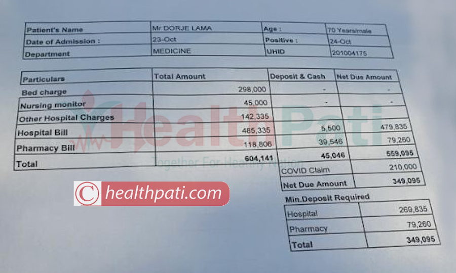 ७० वर्षीय उहाँलाई आइसीयूमा राखेर उपचार गरियो ।संक्रमितको निशुल्क उपचार गर्ने सम्झौता गरेको यस अस्पतालले डिस्चार्ज हुने बेलामा लामाको परिवारलाई ६ लाख बराबरको बिल थमायो। लामाका परिवारले त्यति धेरै पैसा तिर्न नसक्ने बताए। परिवारले सो रकम बुझाउन नसकेपछि लामा चार दिन अस्पतालमै बस्न बाध्य भए।