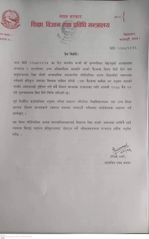 शिक्षा, विज्ञान तथा प्रविधि मन्त्री कृष्णगोपाल श्रेष्ठको अध्यक्षतामा बसेको मन्त्रालयको आकस्मिक बैठकले वायु प्रदुषणका कारण बालबालिकाको स्वास्थ्यमा गम्भिर असर पर्न सक्ने भन्दै सम्पूर्ण शिक्षण संस्था बन्द गर्ने निर्णय गरेको हो।