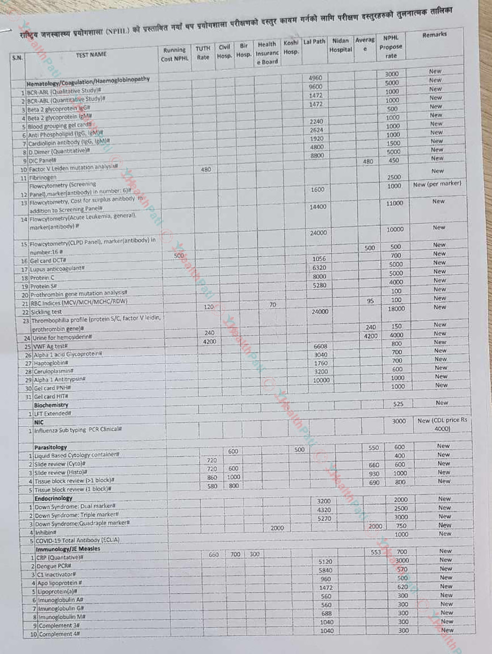 जनस्वास्थ्य प्रयोगशालाले गरेको प्रस्तावित नयाँ थप प्रयोगशाला परीक्षण दस्तुरमा हाल बाहिर भइरहेको शुल्कमा ९० प्रतिशतसम्म घटाइएको छ । १० हजार शुल्कमा भइरहेको जेल कार्ड पीएनएच परीक्षण जनस्वास्थ्य प्रयोगशालामा १ हजारमा गर्नेगरी प्रस्ताव गरिएको छ ।