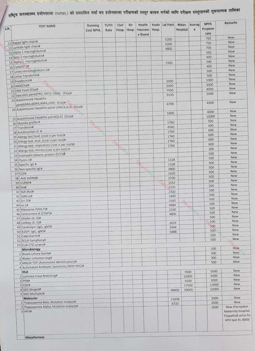 यसैगरी रगतको क्यान्सरको परीक्षण (फ्लोसाइटोमेट्री मार्कर एन्टीबडी) पनि जनस्वास्थ्य प्रयोगशालामै हुने भएको छ । यसको परीक्षण शुल्क दस्तुर १० हजार रुपैंया प्रस्ताव गरिएको छ, जबकी हाल लाल प्याथले यस परीक्षणको शुल्क २४ हजार लिने गरेको छ ।