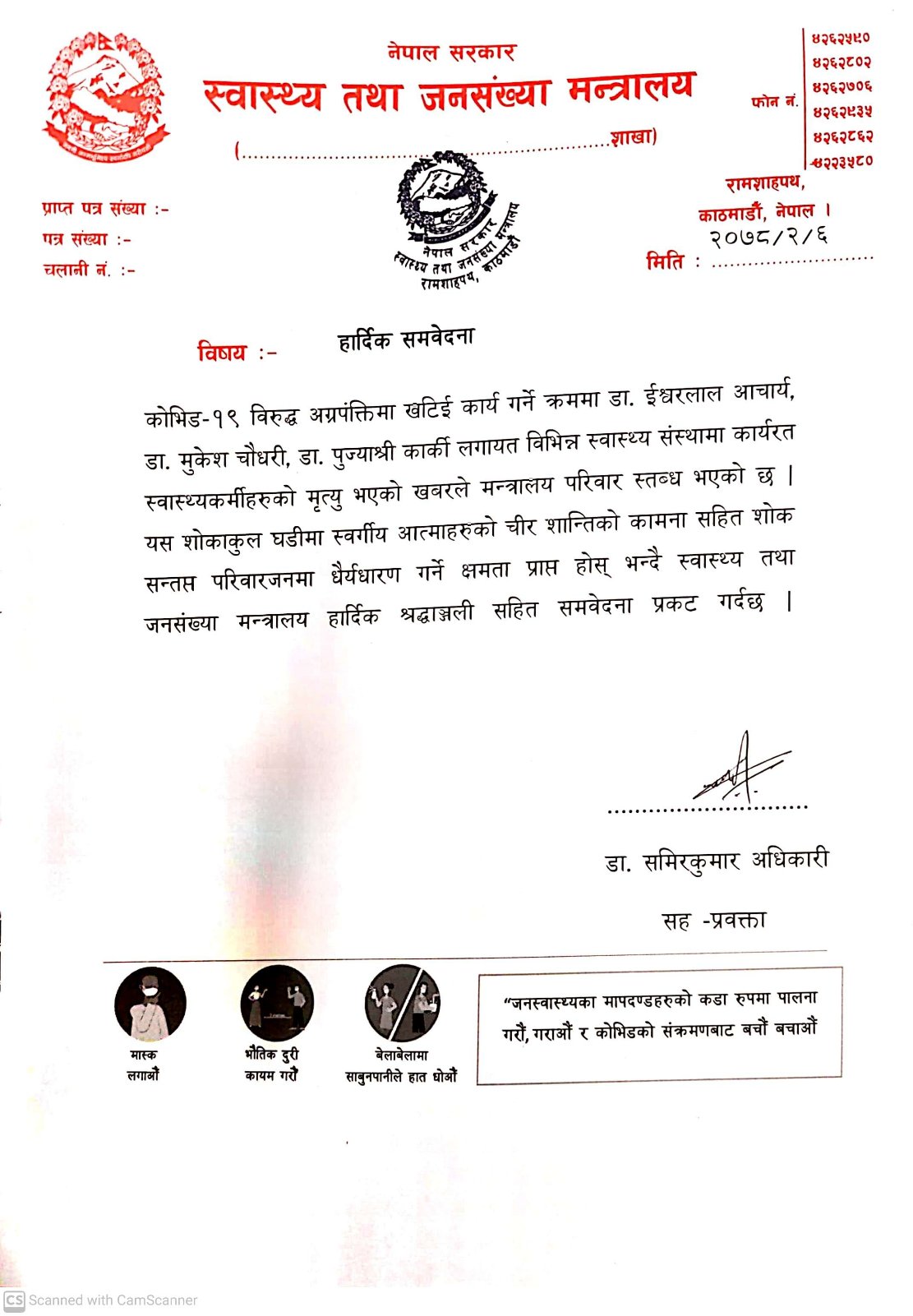 कोरोनाबाट तीन डाक्टरको निधनप्रति मन्त्रालयद्वारा दुःख व्यक्त